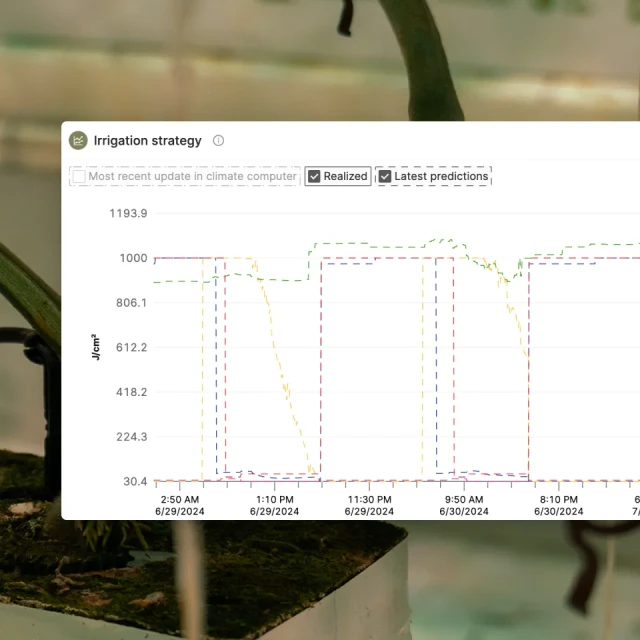 Onze AI-gedreven oplossing geeft exact de juiste hoeveelheid water en nutriënten, zorgt voor consistente groei op elke locatie en verlaagt het risico op gewasstress.